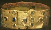 The crown was broken into 15 pieces has been repaired at least twice. Once sometime during the Middle Ages, and again in 16th or 17th century where the copper bands were added.
