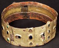 The krona is made of two layers of copper sheet. The outer layer has been “burngilded” with gold. The crown has eight short points and is decorated with engraved designs set with blue, red and green glass. Small holes around the base of the band indicate that a cap was sewn into it for the comfort of the wearer.