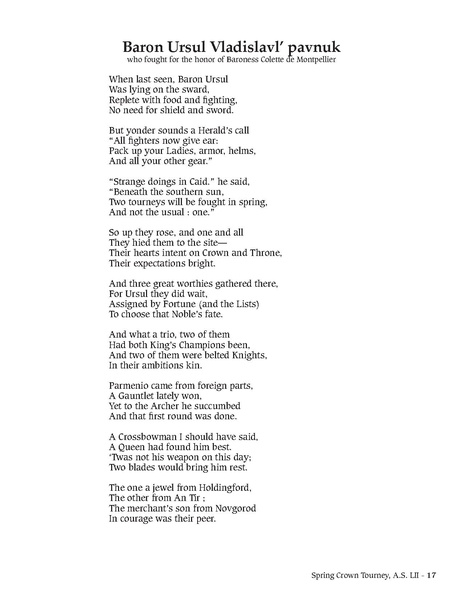 current | 14:41, 20 May 2025 | ![]() | 1,275 × 1,650, 34 pages (2.32 MB) | Avicia (talk | contribs) | Crown Poems for Spring Crown Tourney 2018, presented at the Coronation of Agrippa III and Dawid in June 2018. All copyright is retained by the original authors. |