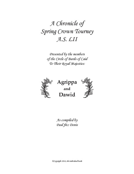Crown Poems for Spring Crown Tourney 2018, presented at the Coronation of Agrippa III and Dawid in June 2018. All copyright is retained by the original authors.