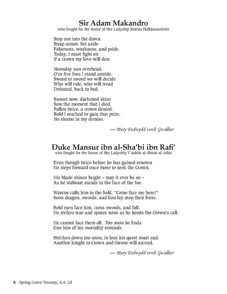 Crown Poems for Spring Crown Tourney 2018, presented at the Coronation of Agrippa III and Dawid in June 2018. All copyright is retained by the original authors.