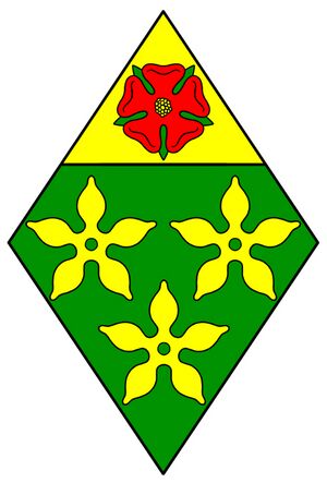![]() Vert, 3 fraises Or, pierced Vert, on a chief Or a rose Gules barbed and seeded proper. | ||||||||||