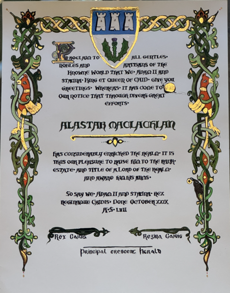 AoA scroll for Alastar MacLachlan, Scroll by Fyvie Ohe.