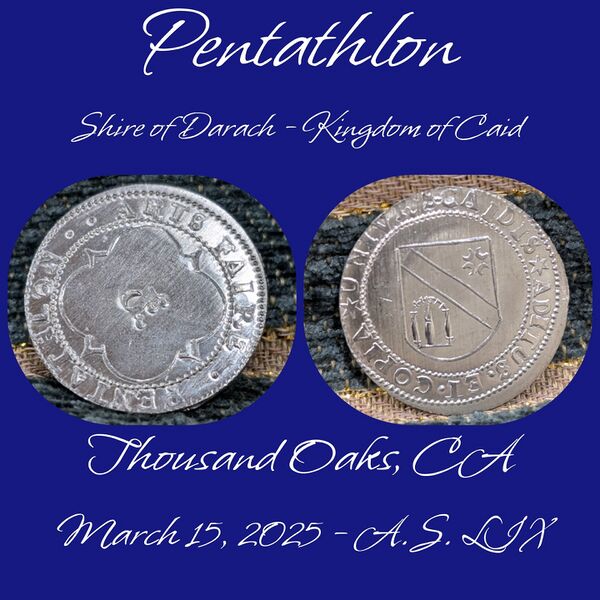 Composite image with Pentathlon 2025 event information and site token images. Image was created by THL Jerusha a'Laon for her event report for The Virtual Herald.