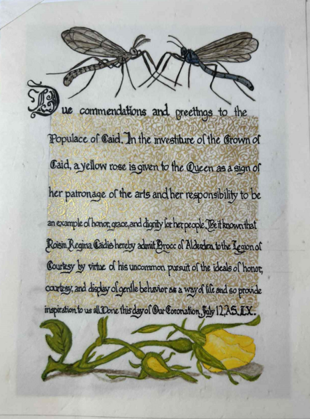 Legion of Courtesy scroll for Brocc of Alderden, Scroll by Tetchubah of Greenlake.