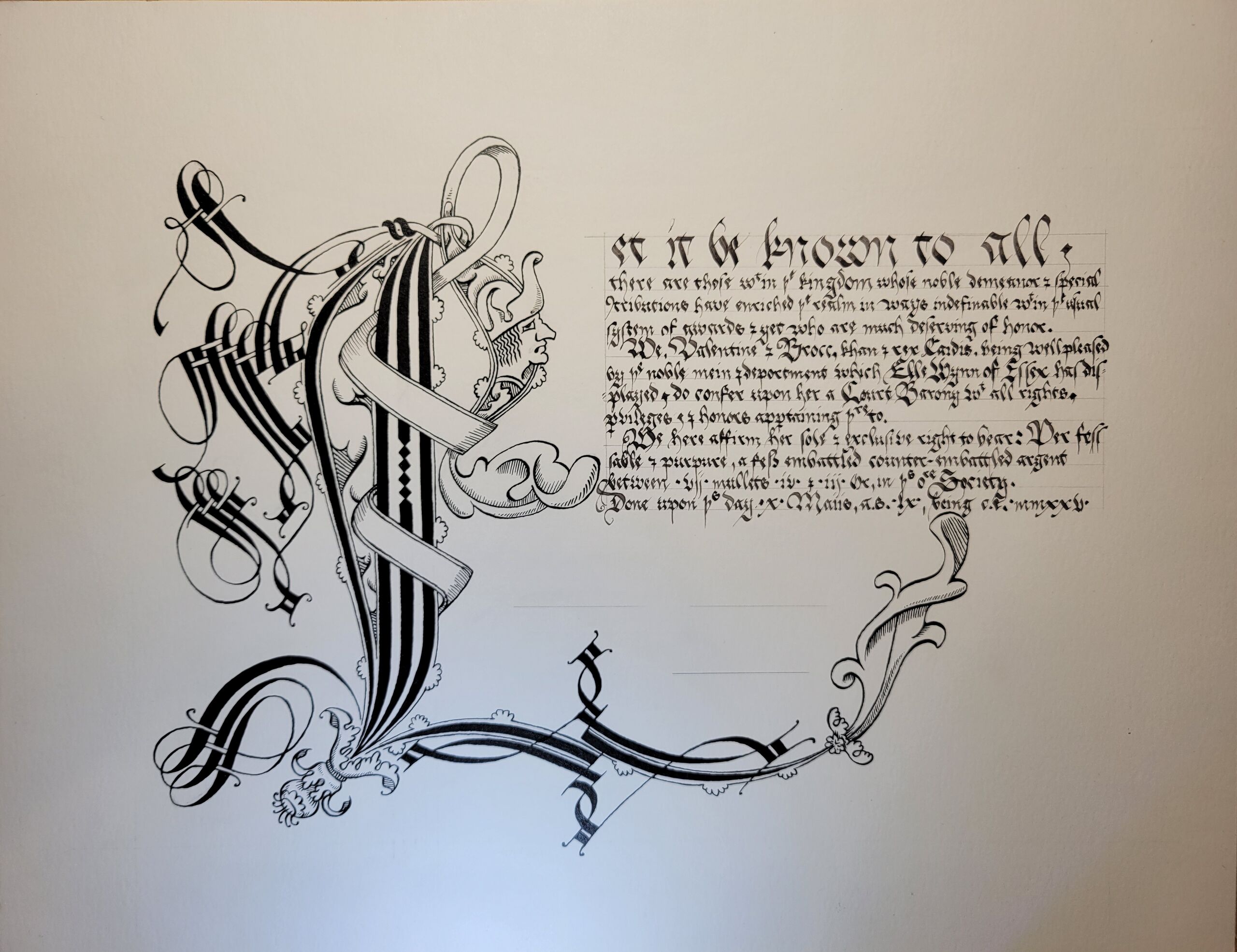 Court Barony scroll for Elle Wynn of Essex, Illumination by Vettorio Antonello, East, Scribes at Large (Out of Kingdom Scribes), Calligraphy by Thomas Brownwell.