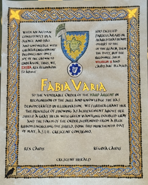 Harp Argent scroll for Fabia Varia, Scroll by Fyvie Ohe.