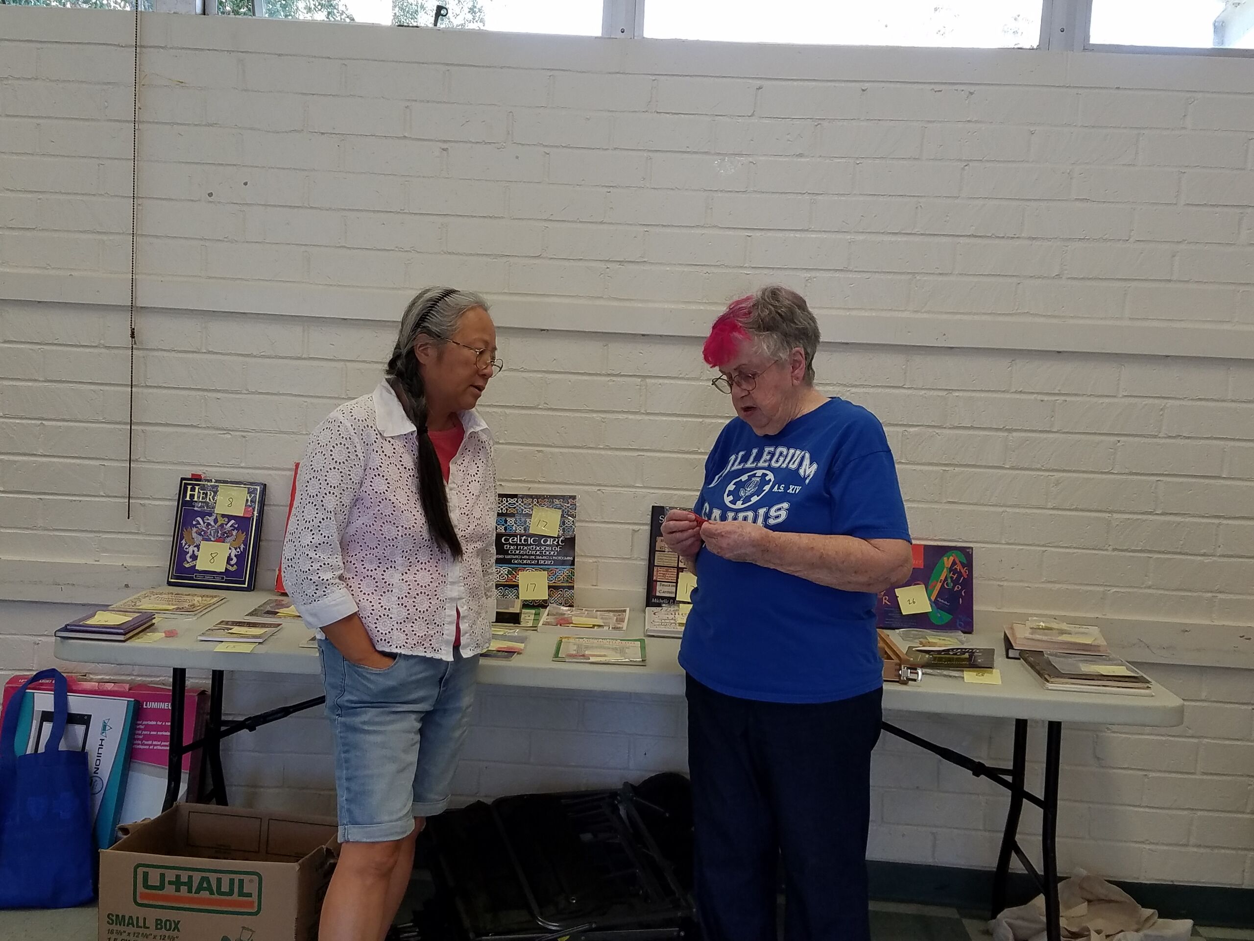 Scribal and Heraldic Playday Kong Lian and Flavia Beatrice Carmigniani in front of the raffle table.