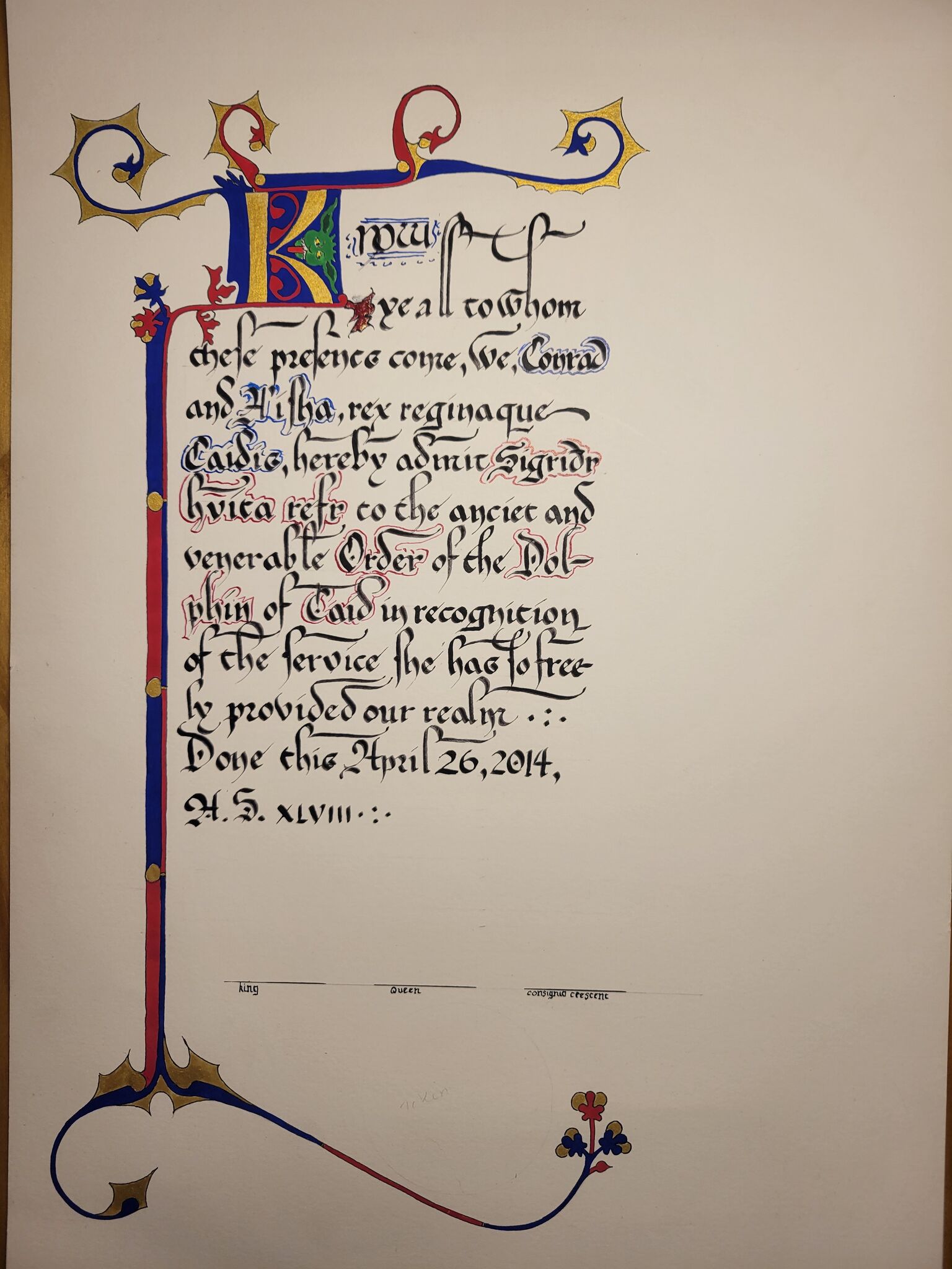 Dolphin scroll for Sigríðr hvíta refr, Illumination by Rónán mac Magnusa and Astrid skalphæna, Calligraphy by Danniell de Hartfield.