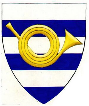 Barry argent and azure, a spiral hunting horn of three spirals reversed Or. | ||||||||||