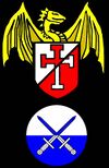 ![]() Registerd. Per bend sinister sable and gules, a phoenix Or issuant from flames proper and a shark naiant Or. | ||||||||||